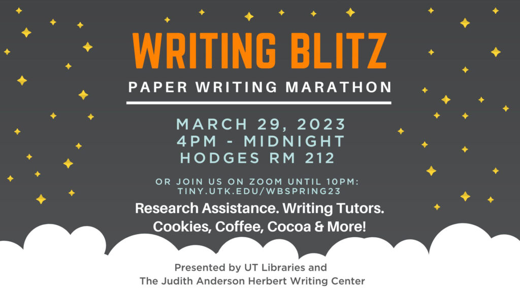 Join us for a paper writing marathon Wednesday, March 29, in 212 Hodges Library, 4 p.m. to midnight. Research and writing help will be available until 10 p.m., in person or via Zoom at http://tiny.utk.edu/WBSpring23. Librarians will be on hand to offer research assistance, and tutors from the Judith Anderson Herbert Writing Center will be available for writing and citation needs.