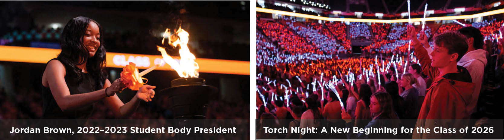Torch Night: A New Beginning is a rite of passage for incoming Volunteers. At the beginning of each academic year, the entire first-year class gathers to take up the Torch of Service and commit themselves to the Volunteer ideal of selfless leadership. Continuing a time-honored tradition, students raise orange or white glowing sticks and recite a pledge to “represent my university and my fellow Volunteers with honesty, compassion, and courage … and to light the way for others.”