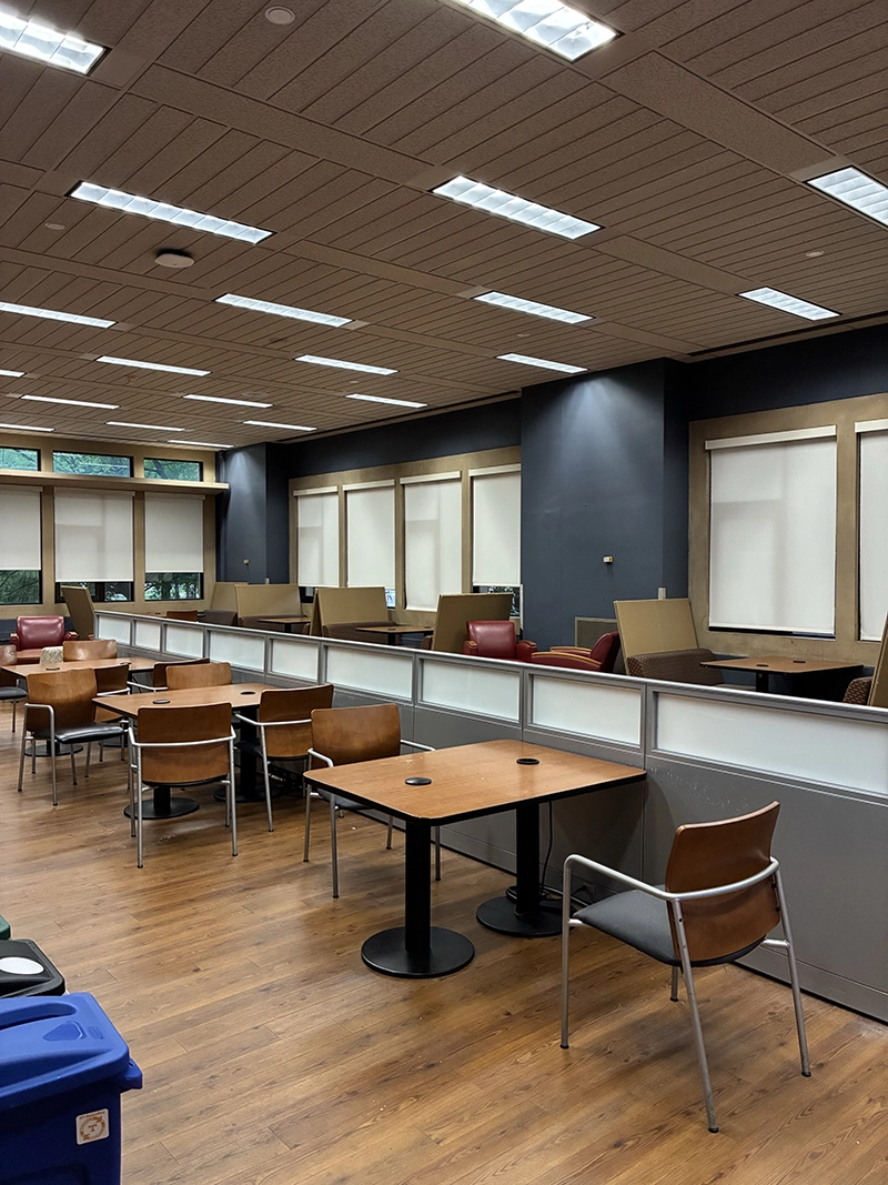 Located just behind the Starbucks, this area contains seating with dining in mind.
