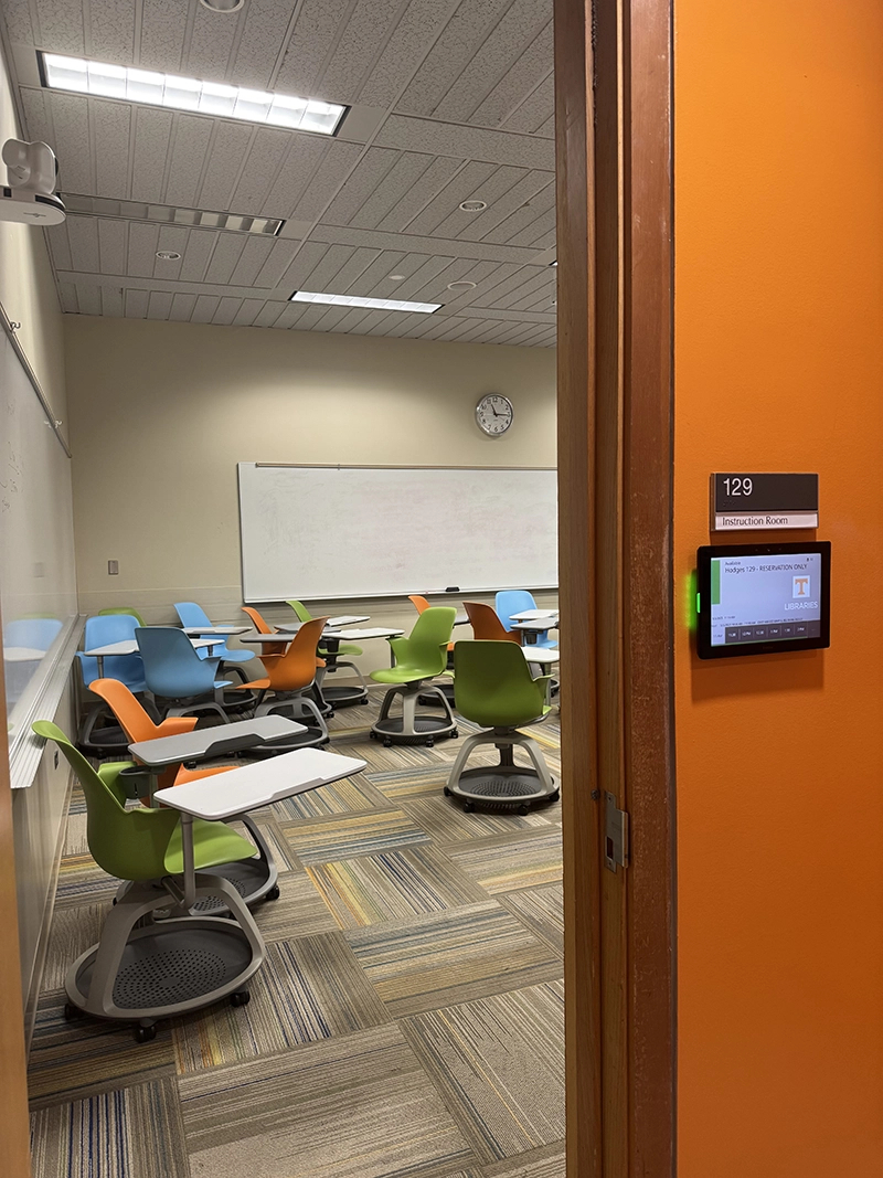 LIB 129 is a smaller classroom on the first floor. It has a fully featured podium setup, including projector, sound system, microphone, document camera, and hybrid classroom camera. Additionally, it features full 360 whiteboards.