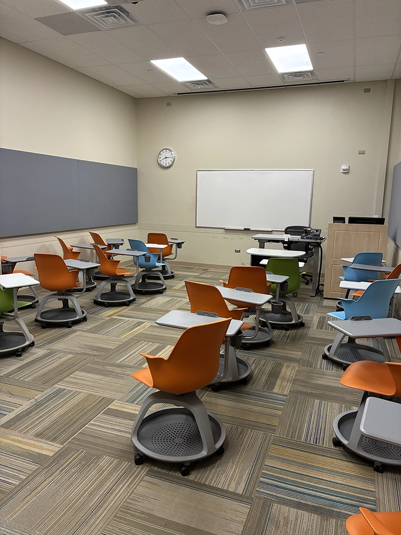 LIB 212 is a smaller classroom on the second floor. It has a fully featured podium setup, including projector, sound system, microphone, document camera, and hybrid classroom camera.