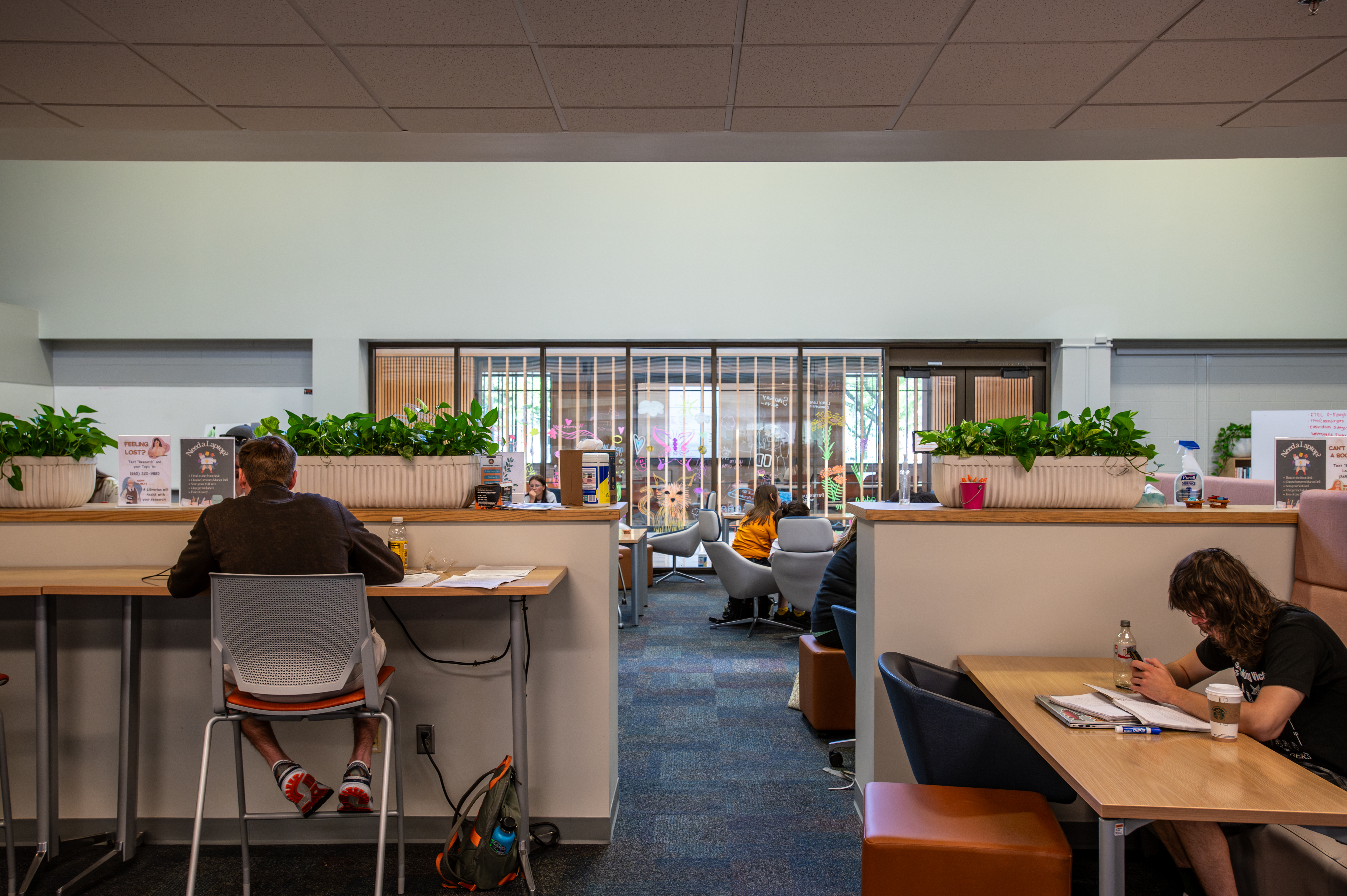 Also located here is the Pendergrass Public Service Desk, where patrons can: borrow and return loaner equipment, books, and other library materials; pick up posters and 3D prints; pay library fines and fees; and ask questions and get help.