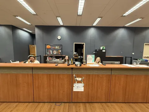 The public services desk at Devine Library is where patrons can check out return items, ask about equipment, and ask for library assistance. The desk also often displays upcoming events or other important new information for patrons visiting Devine Library.